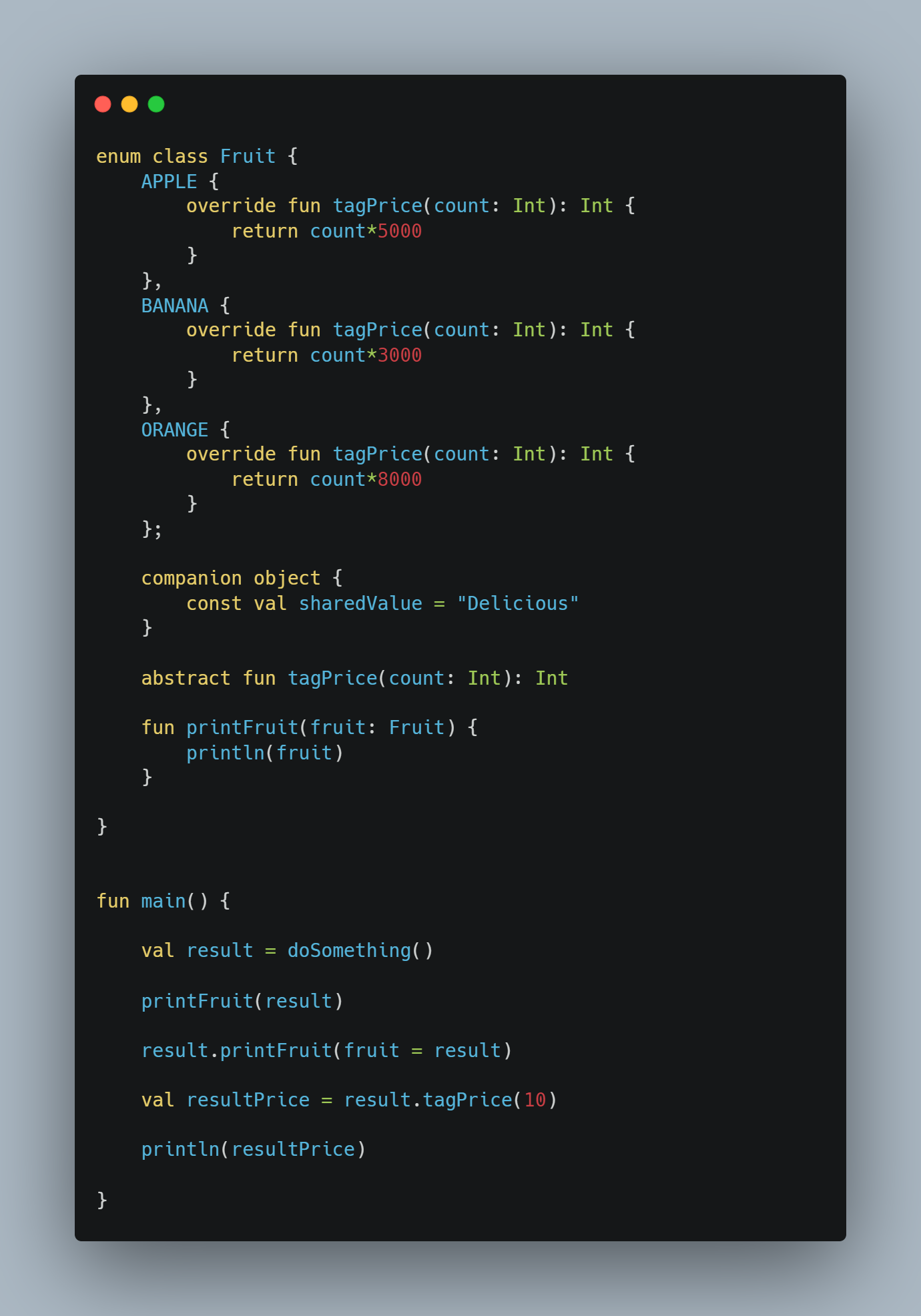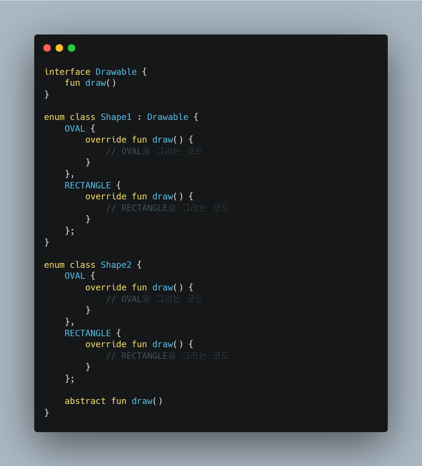 3번과 4번을 보면 enum 클래스에서 선언된 메서드와 프로퍼티는 각 enum 상수에서 사용할 수 있고 내부에 추상 메서드를 선언하여 구현이 가능합니다. 아래의 코드를 보겠습니다. 위의 코드를 약간 수정해 보겠습니다.