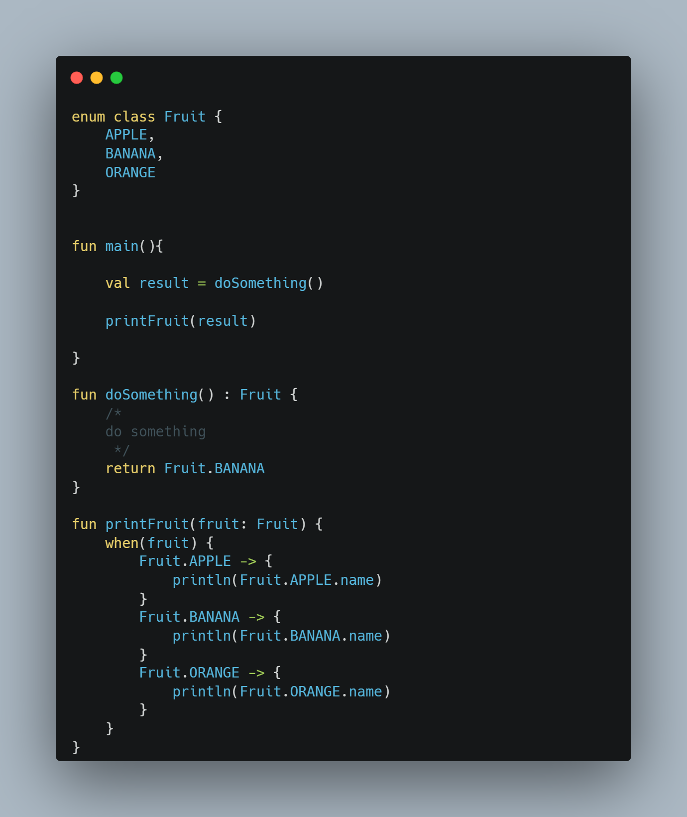doSomething이라는 작업의 결과가 만약에 Fruit 중에 하나로 결정할 수 있다면 다시 말해 어떠한 작업을 하고 그 결과가 열거된 여러 가지 중에 하나를 반환하는 작업을 한다면 이러한 상황에서 Enum은 사용하기에 좋습니다.