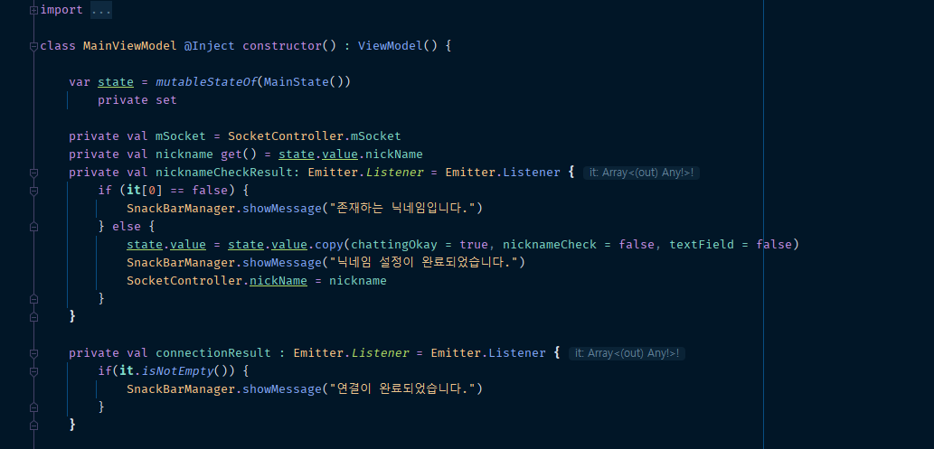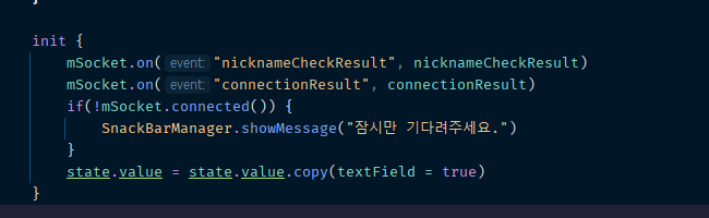 - val connectionResult = 소켓에 연결이 되면 서버에서 안드로이드 쪽으로 connection 이라고 보냅니다. 그때의 리스너입니다.