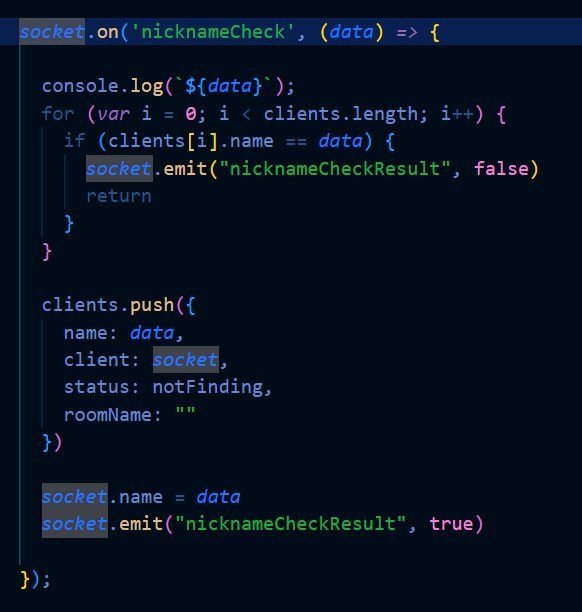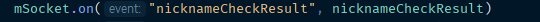 이때 서버의 nicknameCheck 이름으로 된 on 이벤트 함수로 nickname 을 넘겨줍니다.