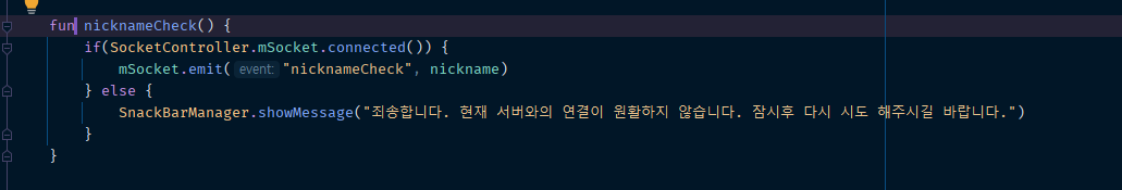 닉네임 만들고 -> emit 으로 전송 -> 소켓에서 닉네임 체크 -> 중복 결과 안드로이드로 전송 -> 화면에 결과 알려줌