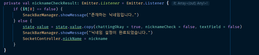 - val nicknameCheckResult = 서버에서 on 으로 보내주는 데이터를 받는 리스너