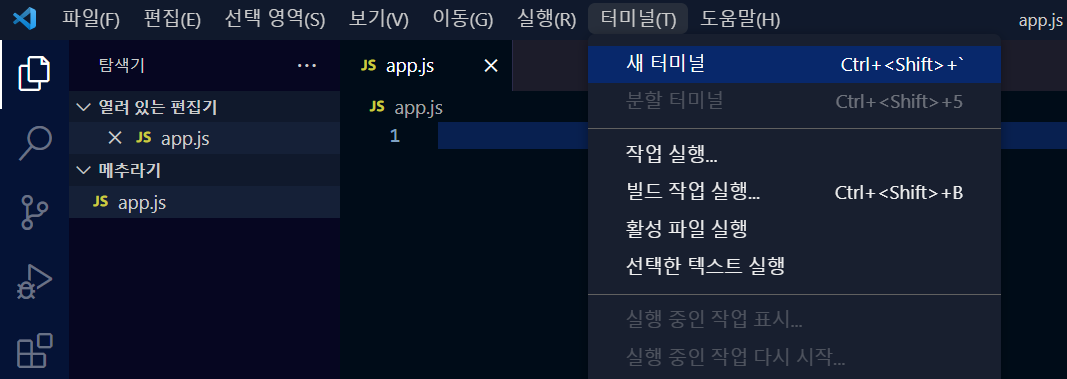 아래 사진처럼 마우스 두면 저렇게 나오는데 눌러서 app.js라는 파일을 만들어줍니다.