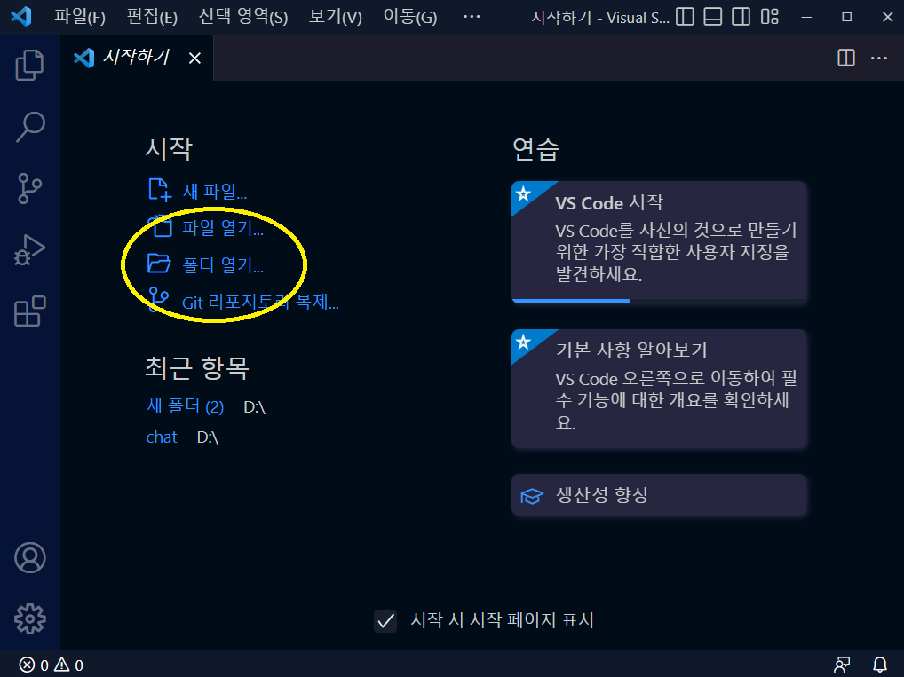 저기 폴더 열기에서 방금 만든 폴더를 선택해줍니다.