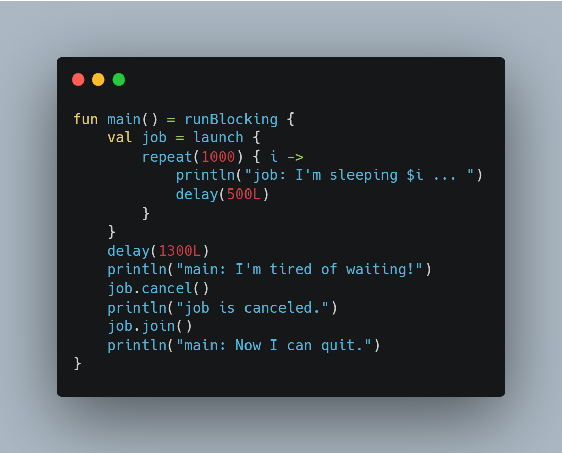 launch로 생성된 coroutine은 job을 반환하고 job은 cancel 가능하다. 이름처럼 도중에 취소할 수 있다.