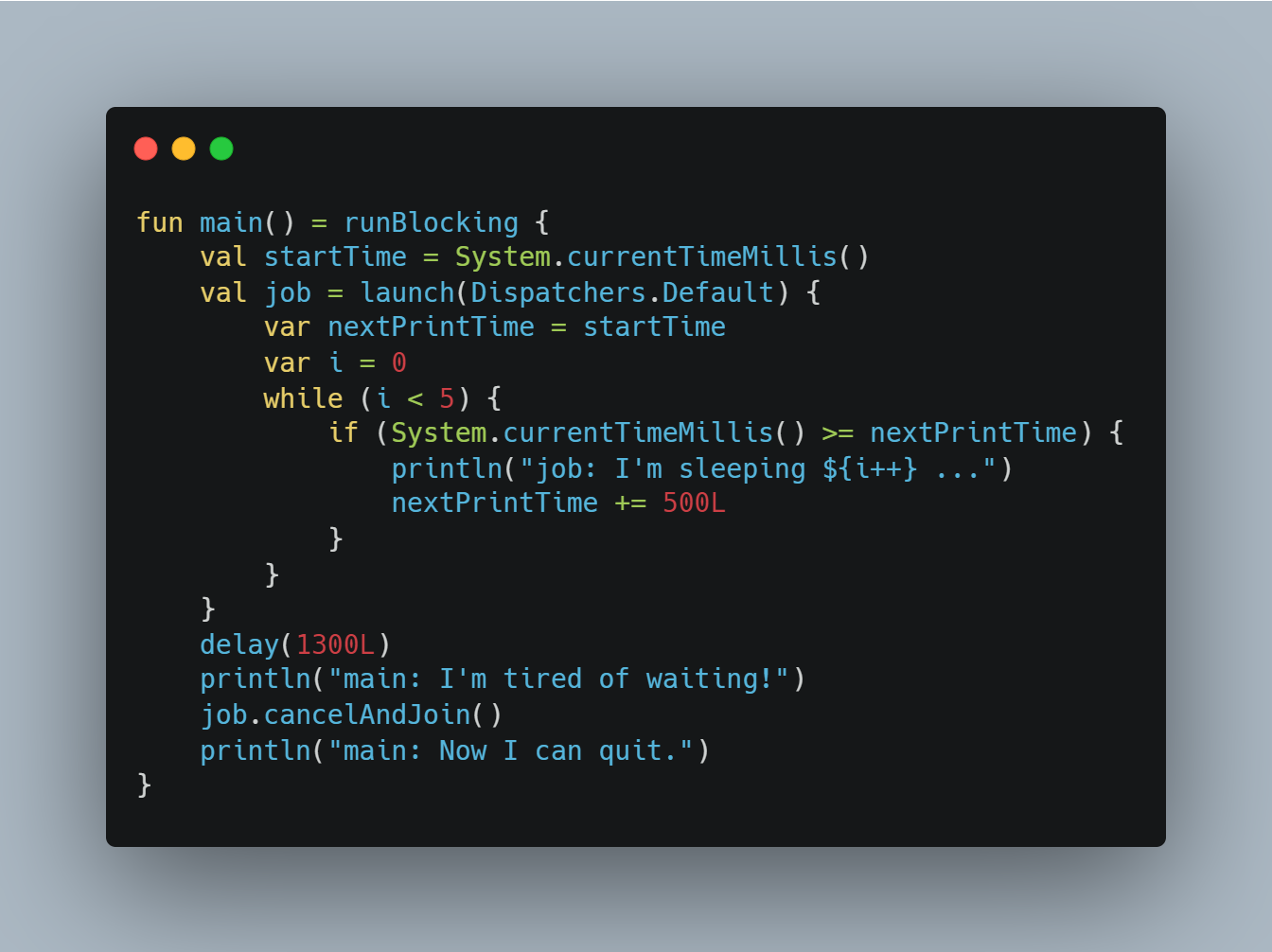 예제 4에서 말했든 coroutine의 cancel은 생성된 코루틴 안에 cancel 가능하게 cooperative 한 방식이 있어야 한다.