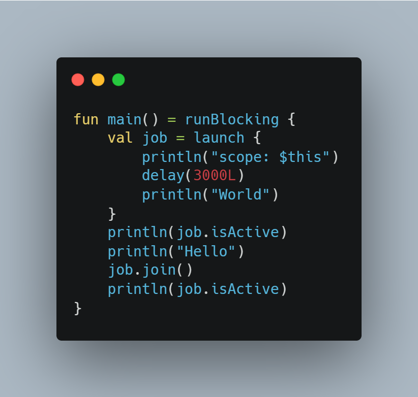 6. 마지막으로 job.isActive를 출력하고 나온다. 이 때는 job이 끝난 상태이므로 false가 출력된다.