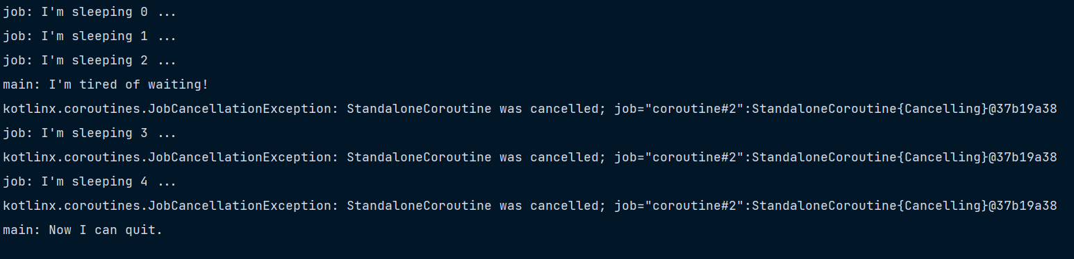 3. 2번이 나오고 repeat 3번째에 coroutine1의 delay가 끝나 main: I'm tired of ~ 가 출력되고 바로 job이 cancel 된다.