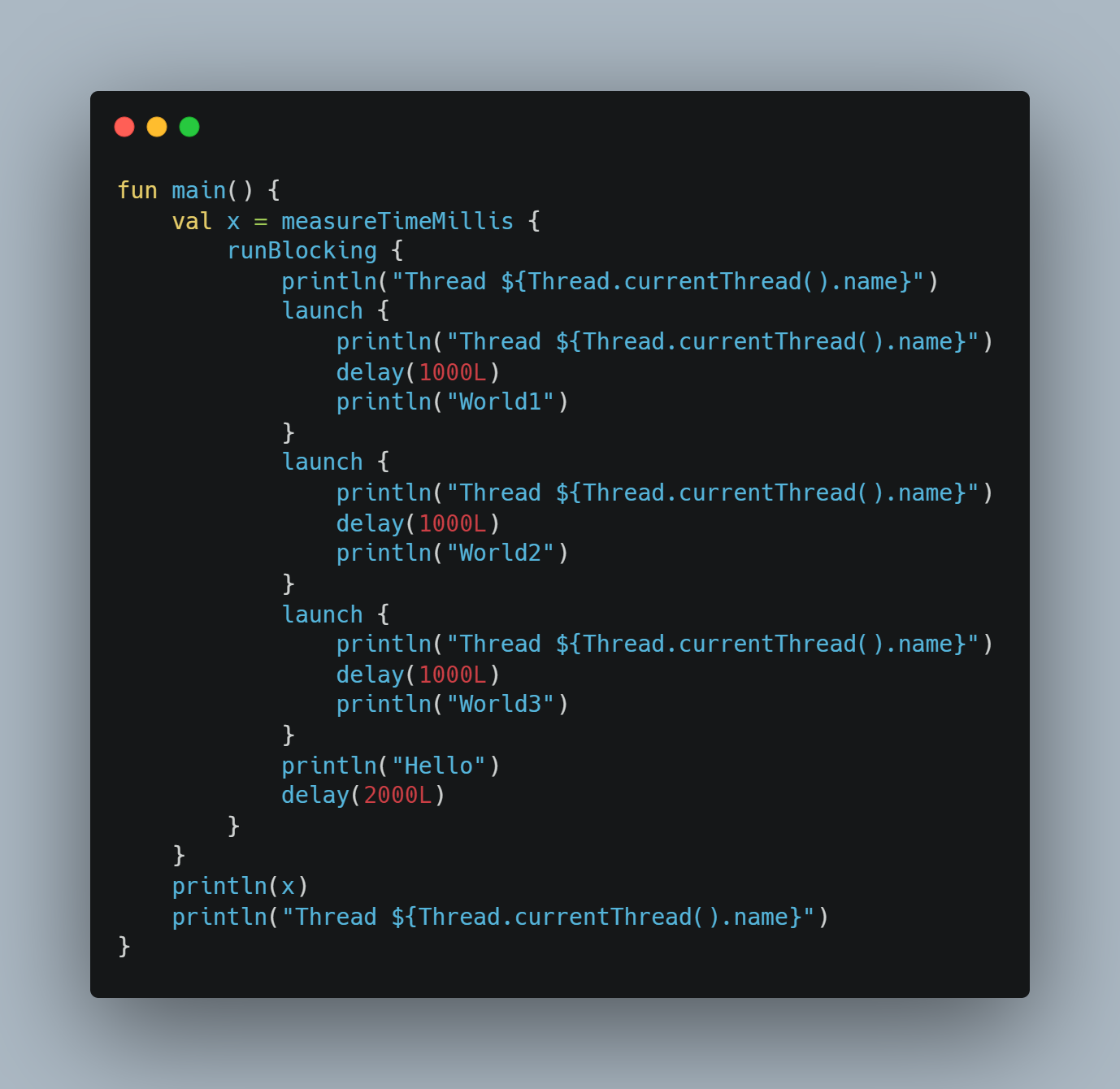 3. 각 launch 안에 delay 1000L 이 종료되고 그 후 World1,2,3이 출력됨. 이 때도 같은 delay여도 먼저 종료되는 launch에 따라 순서가 다르게 출력될 수 있음. 중요한 것은 world 1,2,3이 같은 흐름에 출력된다.