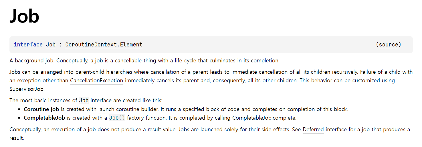 백그라운드 잡이고 개념적으로 Job은 취소할 수 있는 어떠한 것인데 라이프 사이클을 가지고 있고 완료가 되면 종료한다