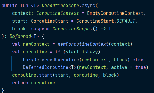 async는 Scope에서 새로운 coroutine을 생성하고 context, start, block을 매개변수로 받으며 Deferred를 반환한다.